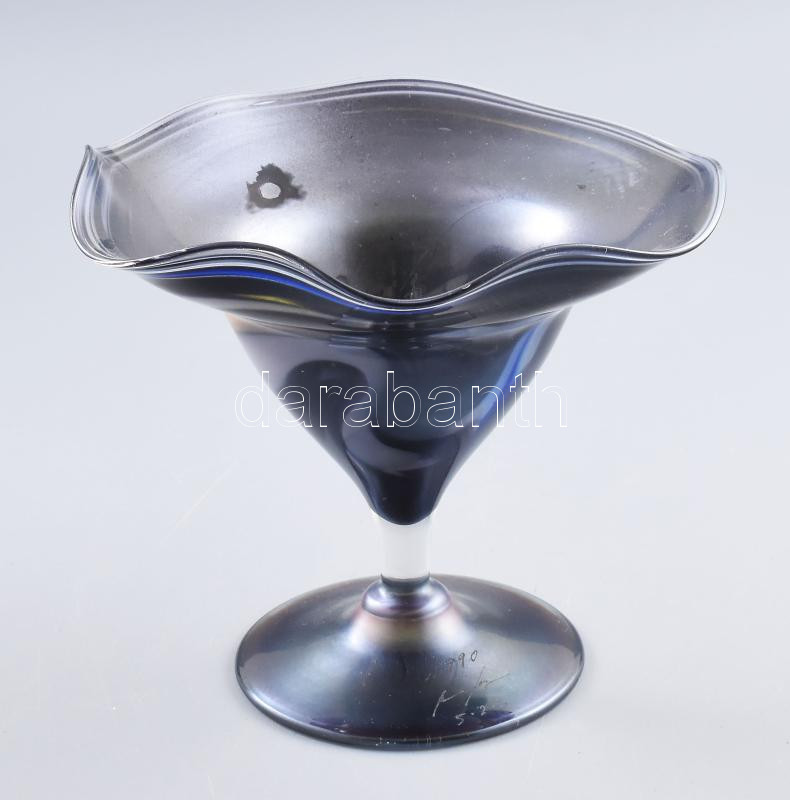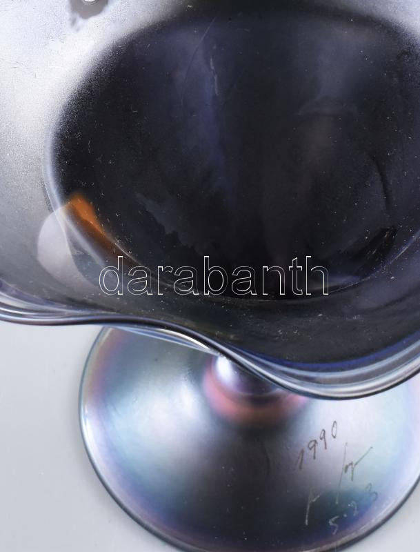 1990 feltehetően francia üvegművész: Fémlüszteres talpas üveg kínáló. Jelzett, kopással, d: 18,5 cm, m: 17 cm