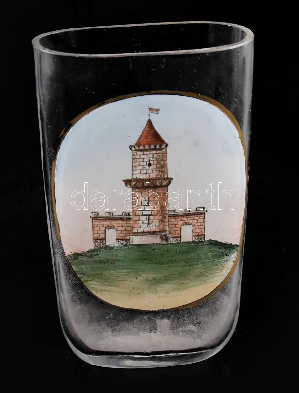 cca 1900 Kőszegi vár mintás kúrapohár, kis pattogzással, m: 9,5 cm