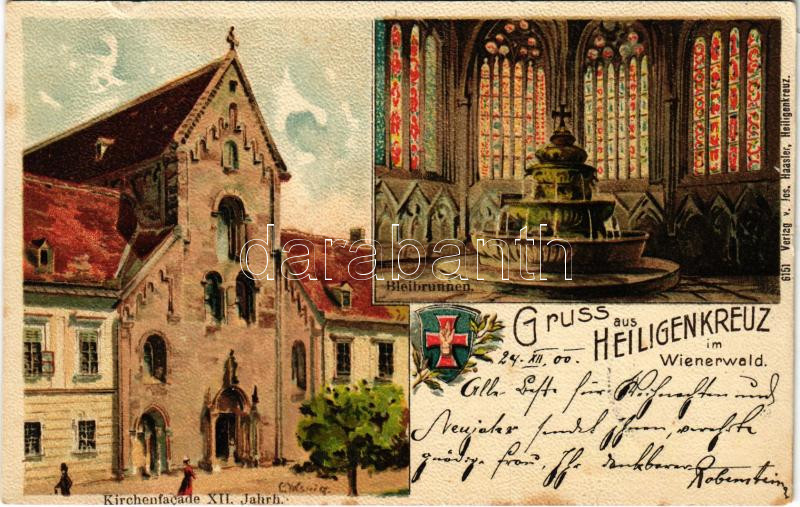 1900 Heiligenkreuz i. Wienerwald, Kirchenfacade XII. Jahrh. Bleibrunnen / church, well. Art Nouveau, litho