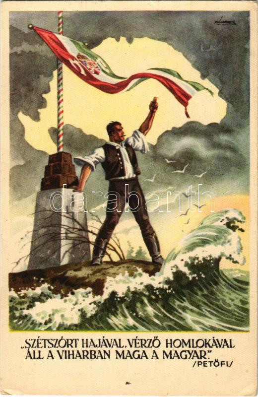 Description: Szétszórt hajával, vérző homlokával áll a viharban maga a magyar. Kiadja az Ereklyés Országzászló Nagybizottsága / Hungarian irredenta propaganda, Hungarian flag, Treaty of Trianon s: Lamoss (EK)