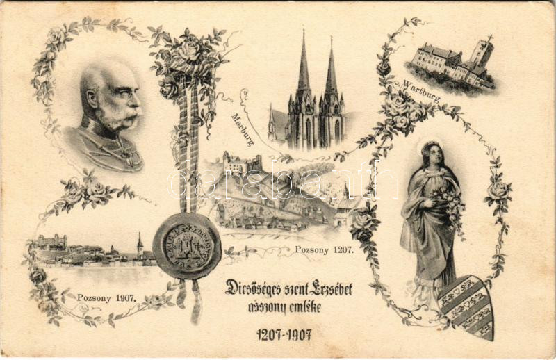 Description: 1207-1907 Pozsony, Pressburg, Bratislava; Wartburg, Marburg, Ferenc József. Dicsőséges Szent Erzsébet asszony emlékére. Szent Erzsébet Jubileumi Bizottság kiadása / Franz Joseph, 700th anniversary of the birth of Saint Elizabeth of Hungary. Art Nouveau, floral (fl)