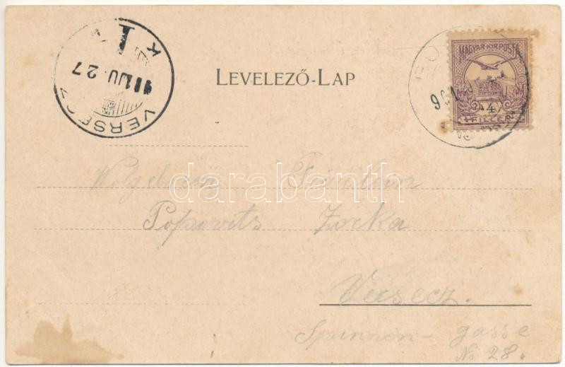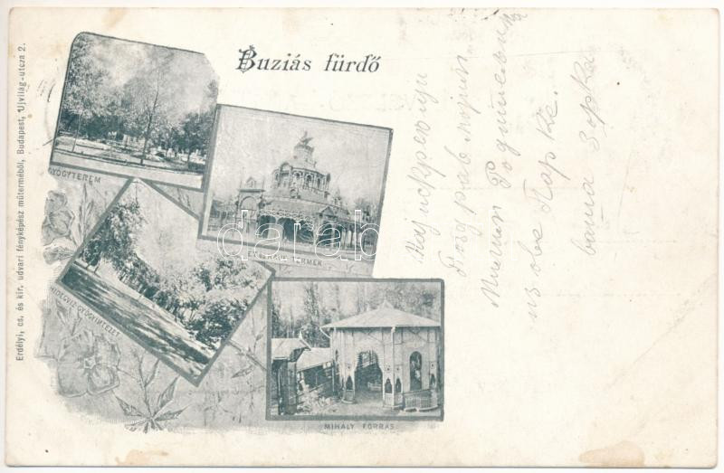 1901 Buziásfürdő, Buziás, Baile Buzias; Gyógyterem, étterem és kávéház, hideg-vízgyógyintézet, Mihály-forrás. Erdélyi cs. és kir. udvari fényképész műterméből / spa, bath, restaurant and café, spring source. Art Nouveau, floral (fl)