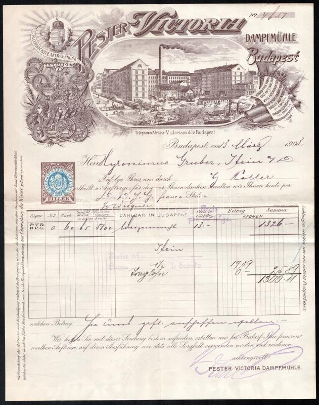1903 Pester Victoria Dampfmühle Budapest fejléces számla, a gyár látké...