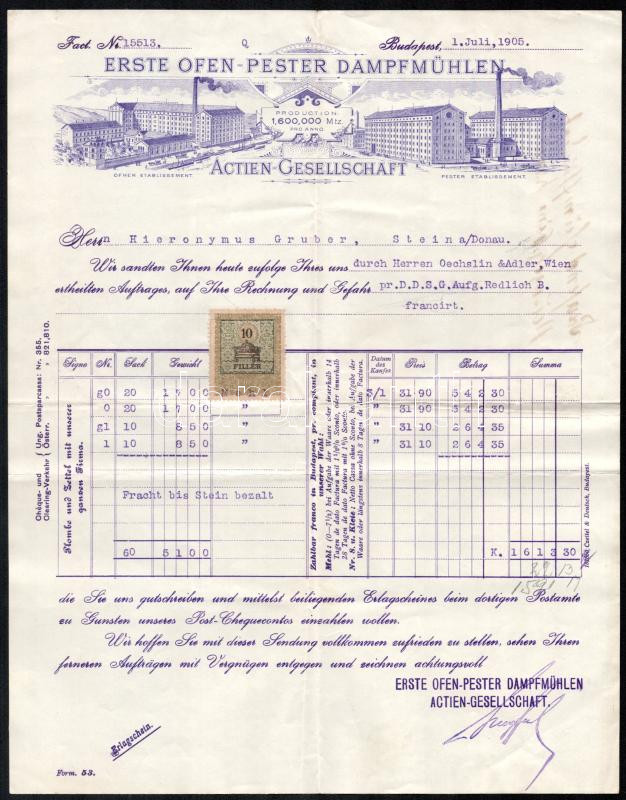 1905 Erste-Ofen-Pester Dampfmühlen Actien-Gesellschaft fejléces számla, rajta a gyár látképe, 10f illetékbélyeggel