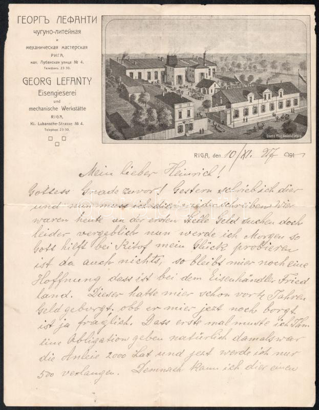 1917 Riga, Georg Lefanty Eisegieserei fejléces levélpapír, rajta a gyá...