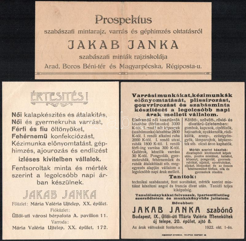1922 3 db szórólap, Jakab Janka, egy Erdélyből a budapesti Mária Valér... https://www.darabanth.com/en/457-Online-auction/457.0/Art-and-other-collectibles/Advertisement~2000359/1922-3-db-szorolap-Jakab-Janka-egy-Erdelybol-a-budapesti-Maria-Valeria-telepre-kerult-szabC3~II3059960