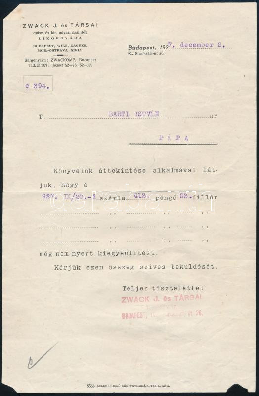 1927 Zwack J. és Társai csász. és kir. udvari szállítók Likőrgyára fejléces Üzleti levél