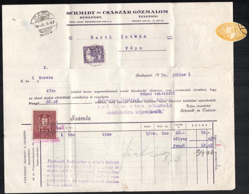1930 Schmidt és Császár Gőzmalom R.T. fejléces számla, sárga színű céges, védjegyes levélzáró bélyeggel