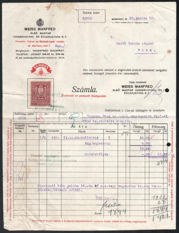 1930 Weiss Manfréd Első Magyar Conservgyára és Ércárugyár R.T. fejléce...
