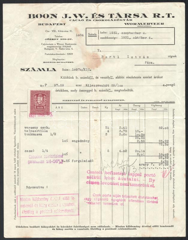 Description: 1931 Boon J.W. és Társa R.T. Cacaó és Csokoládégyár, Budapest VIII. Kőris u. 31. - Wormerveer (Hollandia), szárazbélyegzős védjegy, cégjelzéses fejléces számla, ezenkívűl: 3db ciklámen színű figyelmeztető bélyegzés + 1 db kiegészítő lila színű "Cacaónk zsirtartalma garantáltan 24-26%!" bélyegzés