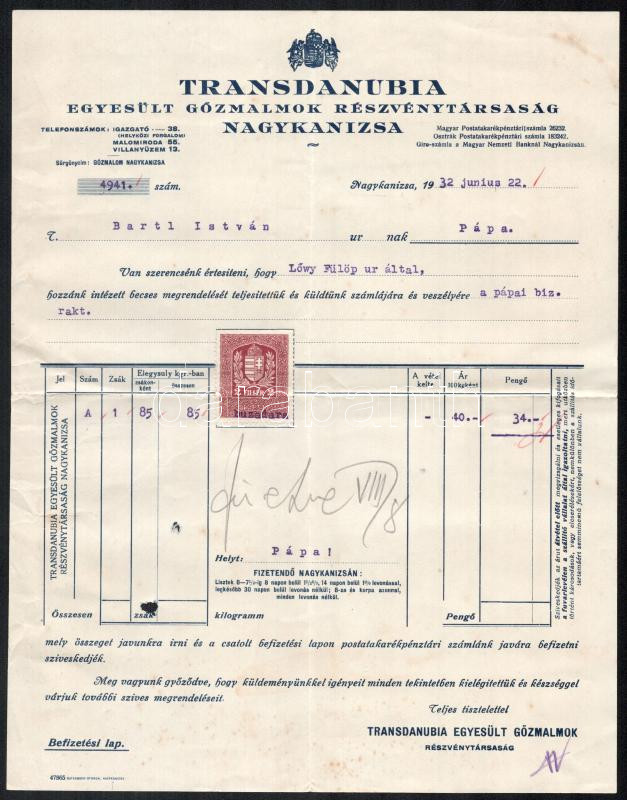 1932 Transdanubia Egyesült Gőzmalmok R.T., Nagykanizsa fejléces számla