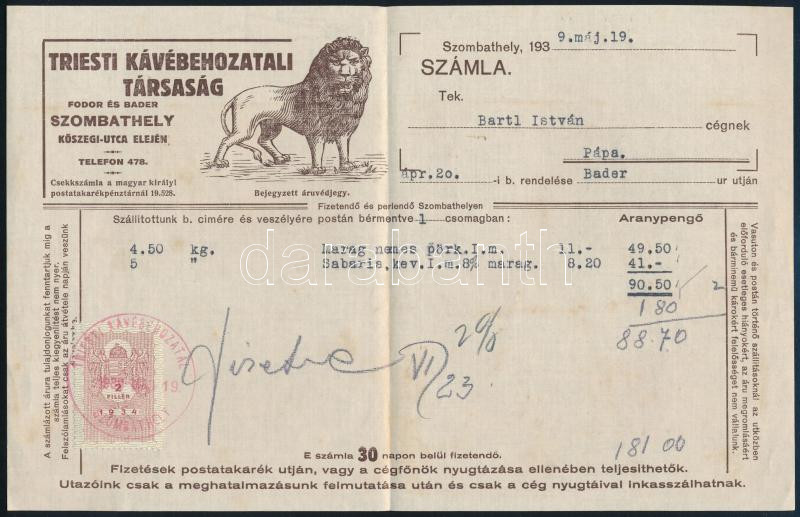 1932 Triesti Kávébehozatal - Fodor és Bader, Szombathely, Erzsébet királyné u.1. Városi bérpalota fejléces számla, ragasztékkal