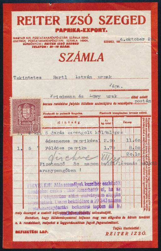 1934 Reiter Izsó, Szeged PAPRIKA-EXPORT fejléces számla