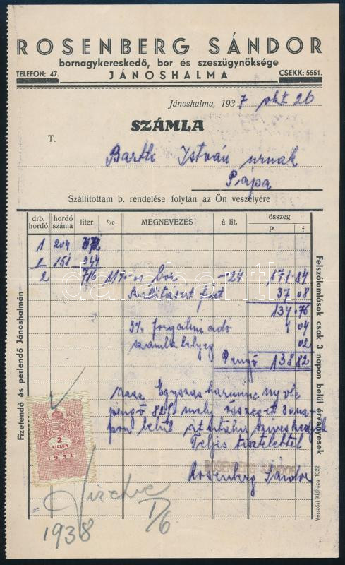 1937 Jánoshalma, Rosenberg Sándor Borkereskedő, Bor és Szesz Ügynöksége fejléces számla