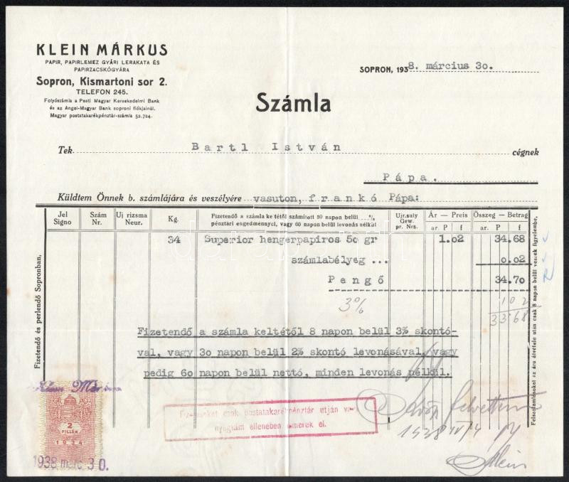 1938 Klein Márkus Papír, Papírlemez Gyári Lerakata és Papírzacskógyár fejléces számla