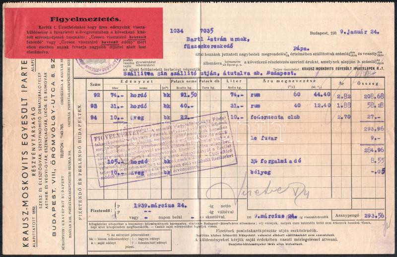 1939 Krausz-Moskovits Egyesült Ipartelepek R.T.,Bp. VIII. Örömvölgy u. 8. fejléces számla,"Figyelmeztetés" kezdetű ragasztékkal
