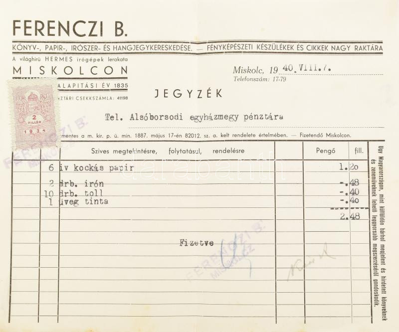 https://www.darabanth.com/en/457-Online-auction/457.0/Art-and-other-collectibles/Advertisement~2000359/1940-Ferenczi-B-konyv-papir-iroszer-es-hangjegykereskedese-Miskolc-fejleces-szamla~II3054704