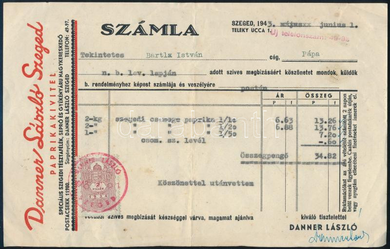 1943 Danner László Paprikakivitel, Szeged fejléces számla