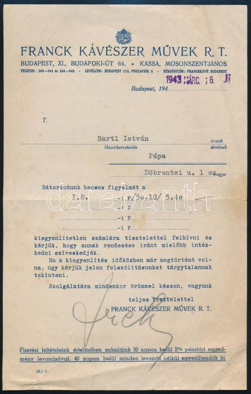 1943 Franck Kávészer Művek R.T. üzleti levél