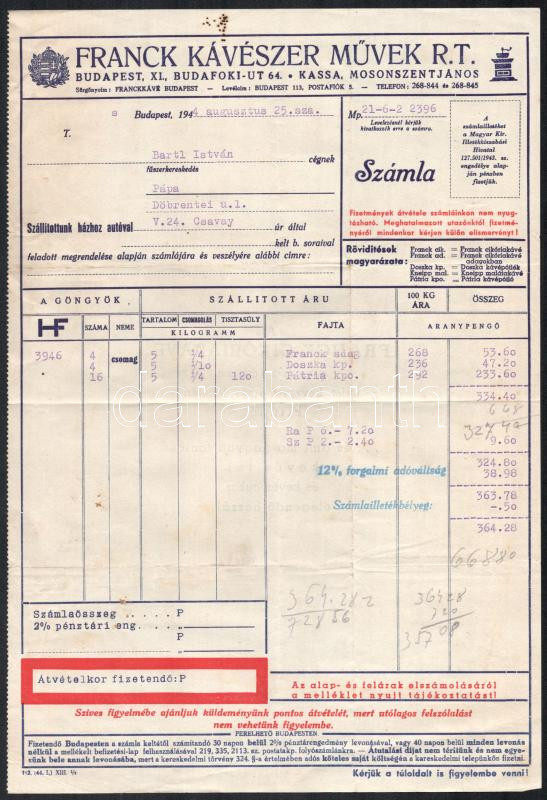 1944.08.25. Franck Kávészer Művek R.T. fejléces számla