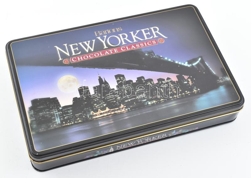Budapesti Keksz- és Ostyagyár bonbonos doboza, kopott, javított, 14x20x2 cm + Bartons New Yorker csokoládés fémdoboz, 19x28x4 cm