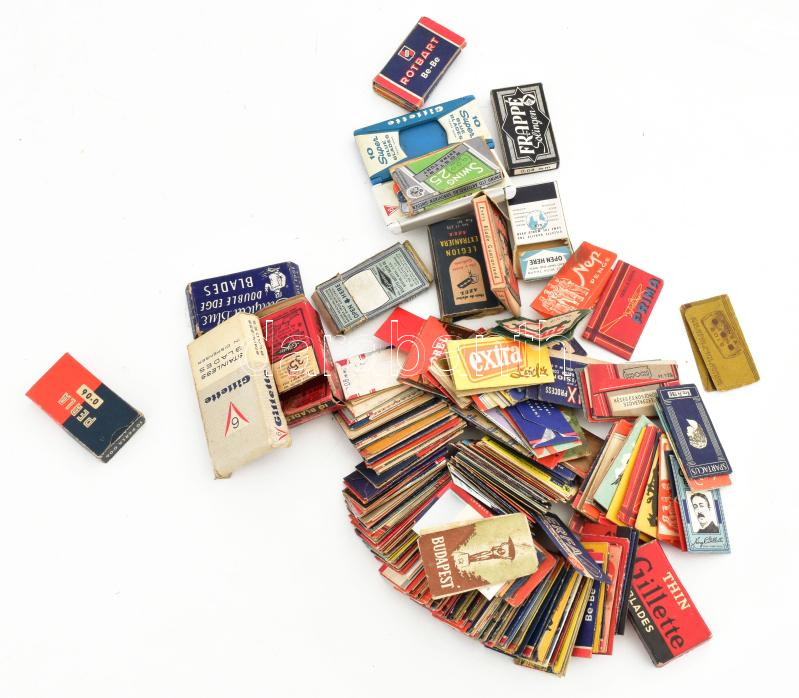 Kb. 260 db borotva penge csomagolás, címke és doboz, régi és retró darabok
