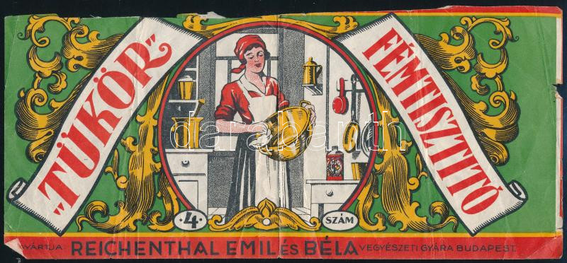 "Tükör" Fémtisztító, gyártja: Reichenthal Emil és Béla Vegyészeti Gyára Budapest címke, hajtott, sérült