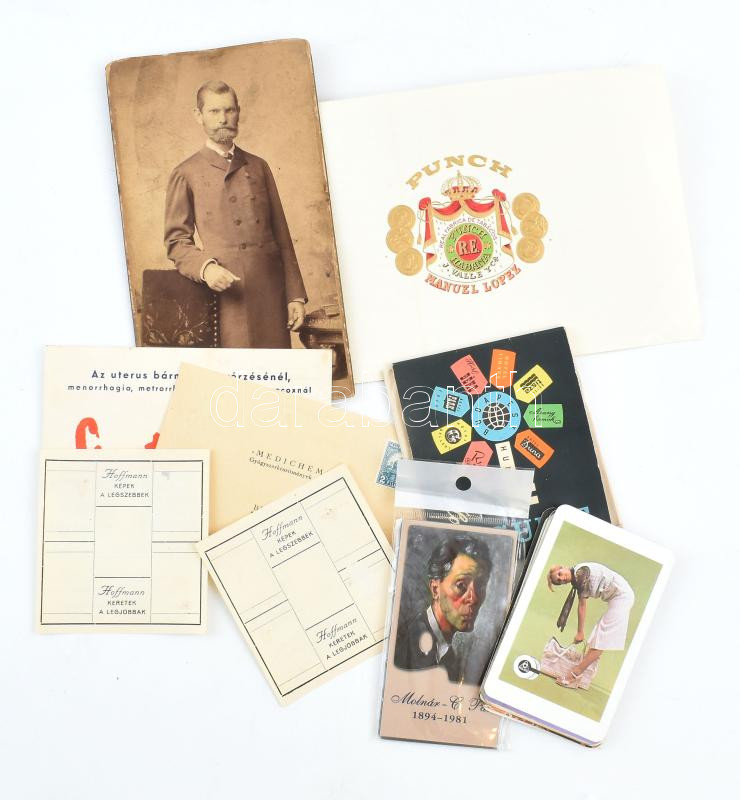 Vegyes papírrégiség és nyomtatvány tétel: régi reklámnyomtatványok, keményhátú fotó, kártyanaptárak, Molnár C. Pál reprodukciók, stb.