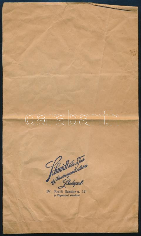cca 1910-1920 Schmidt Viktor és Fiai cég készítményeinek raktára (Bp. IV., Petőfi Sándor u. 12.) reklám papírtasak, hajtva, 28x16,5 cm