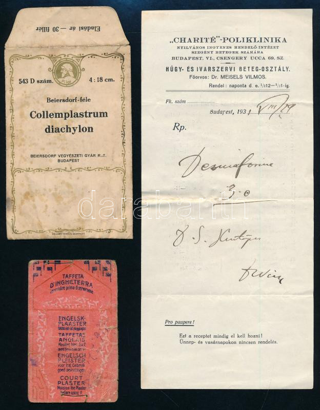 Budapesti Poliklinika Egyesület Gróf Apponyi Albert Poliklinika belorvosi osztálya papír, "Charité" poliklinika húgy- és ivarszervi beteg-osztály recept, Beiersdorf-féle Collemplastrum diachylon zacskó, Taffeta D'Inghilterra tasak (?, hiányos.I)