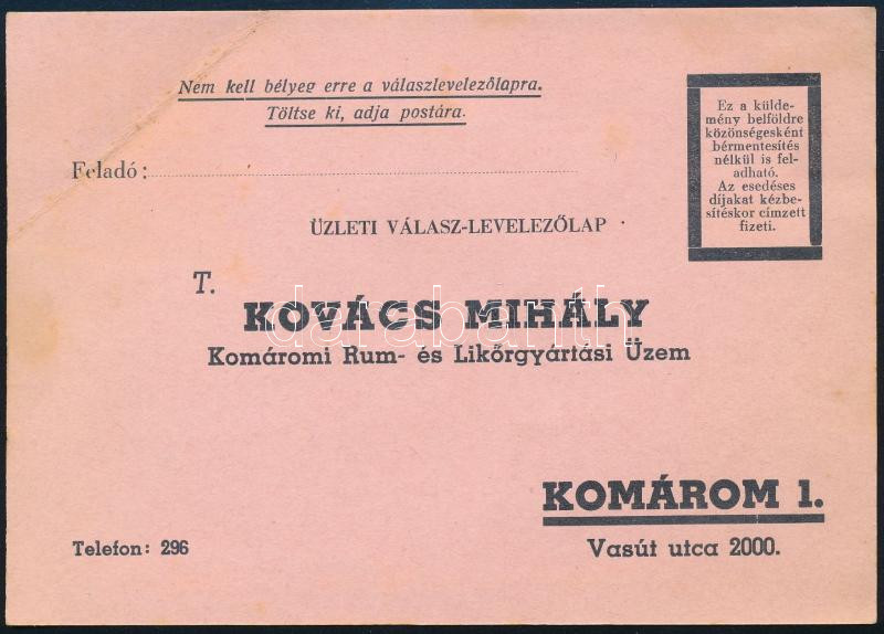 cca 1930 Kovács Mihály Komáromi Rum- és Likőrgyártási Üzem üzleti válasz-levelezőlap