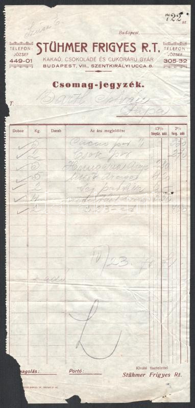 cca 1930 Stühmer Frigyes R.T. Csomagjegyzék