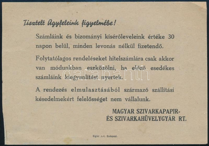 cca 1940 Magyar Szivarkapapír és Szivarkahüvelygyár R.T. Tisztelt Ügyf...