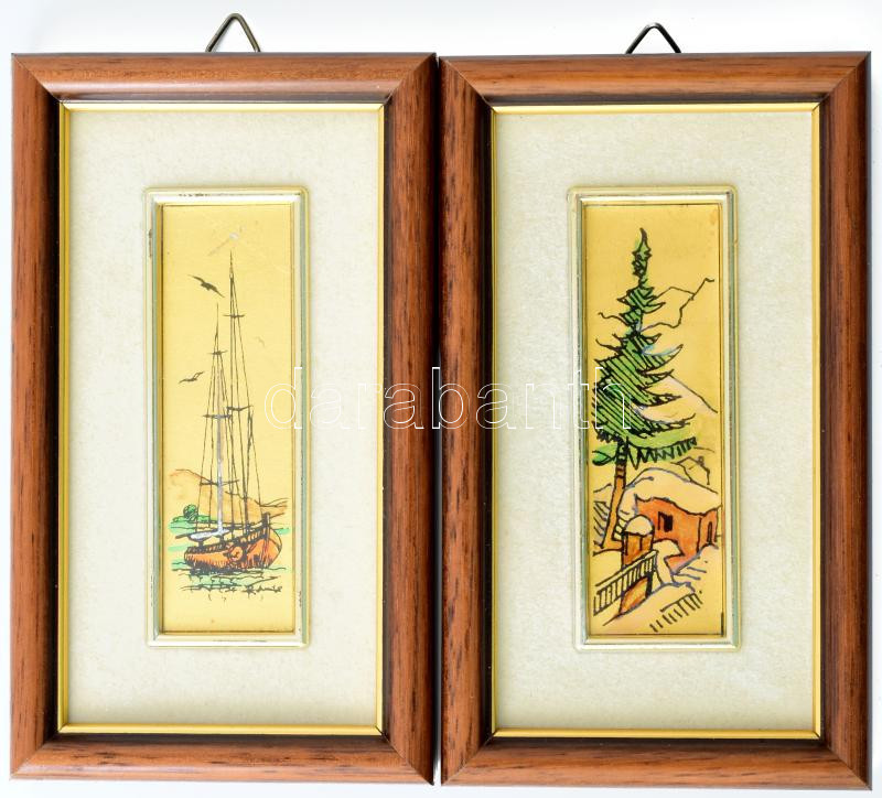2 darab aranyfóliára festett kép, üvegezett fakeretben, 8x2,5 cm, keretezve 13,5x8 cm