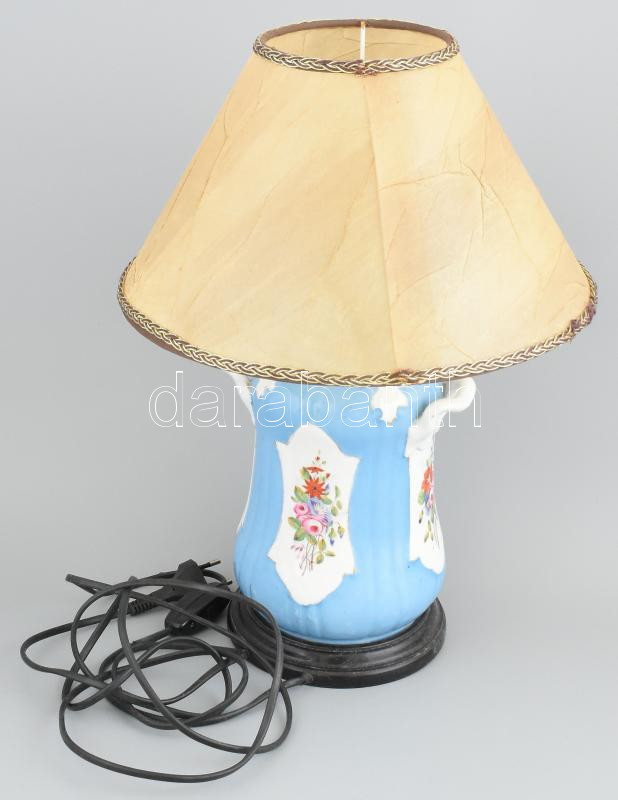 https://www.darabanth.com/en/457-Online-auction/457.0/Art-and-other-collectibles/Antique~500011/Antik-Porcelan-lampa-Antik-kek-feher-szinu-2-fules-kartusokban-viragmintaval-fa-talpon-uj~II2834680