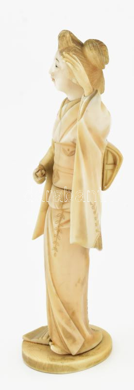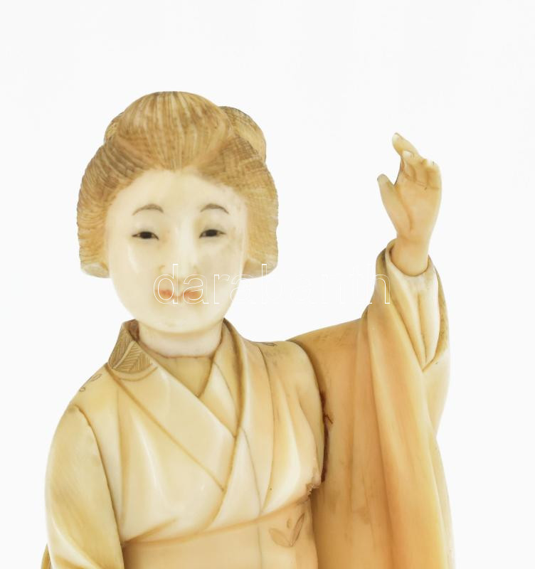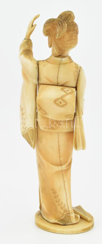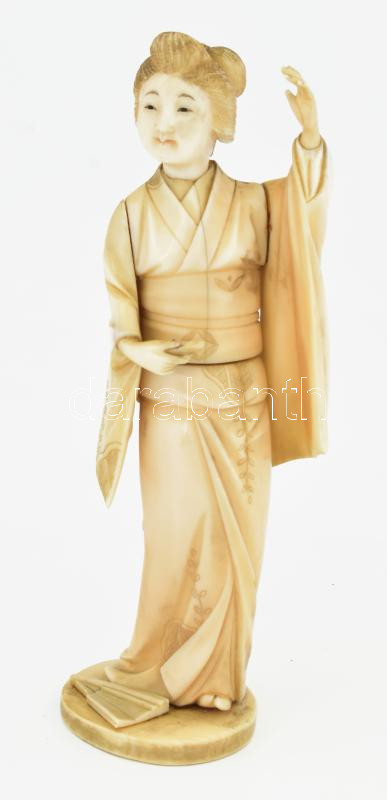 Antik japán csont okimono, gésa, Meiji periódus, jelzett: Gyokushi, kezéből a legyező letört, jelzett, m: 15 cm