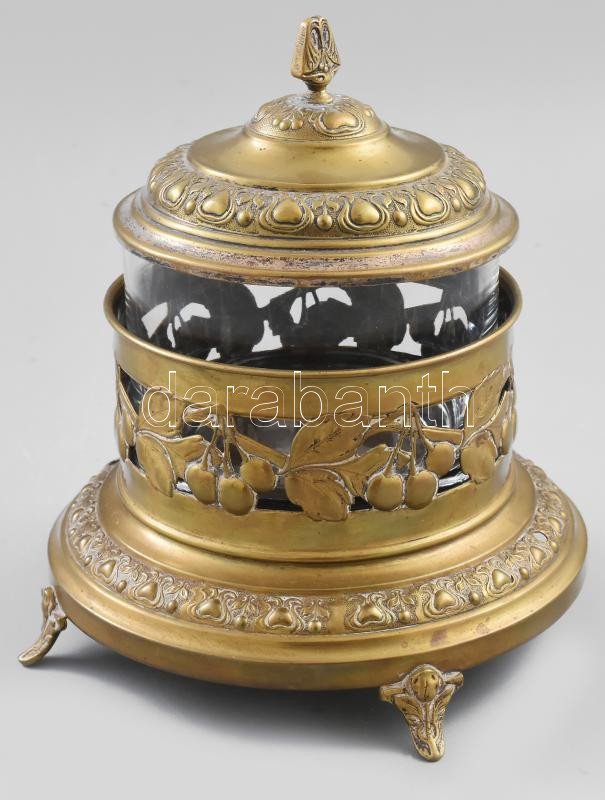 Antik üvegbetétes réz gyümölcskínáló, körben áttört- és gyümölcsminták...