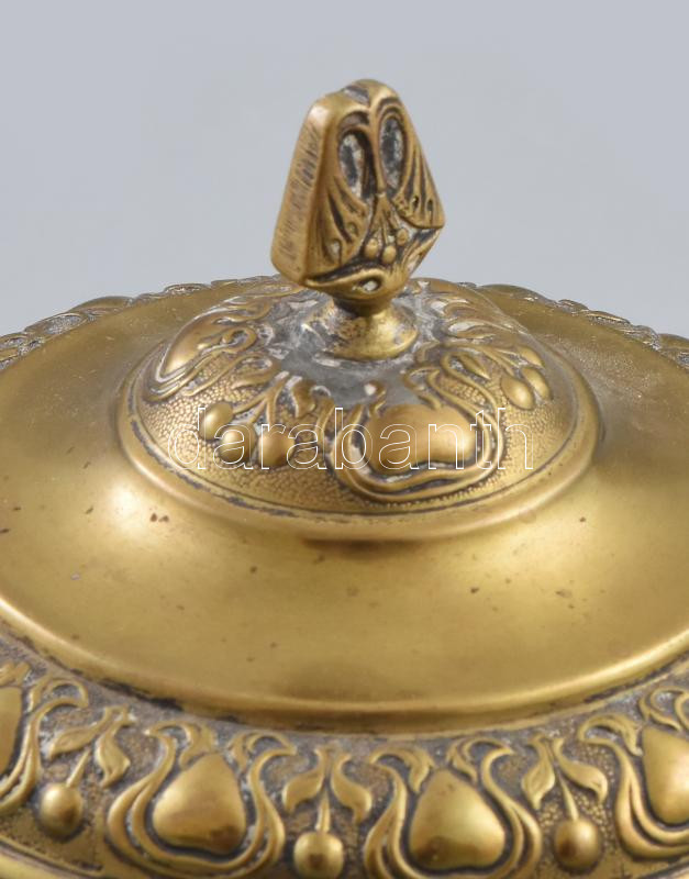 Antik üvegbetétes réz gyümölcskínáló, körben áttört- és gyümölcsmintákkal díszítve, pótolt üvegbetéttel, m: 18,5 cm