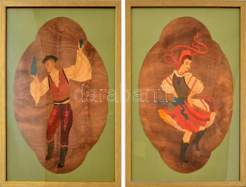 Dobos Andrásné (?-?), XX. sz. közepe, 2 db mű: Táncos és táncosnő. Intarzia, falemez. Jelzés nélkül. Dekoratív, üvegezett fakeretben. 35,5x24 cm