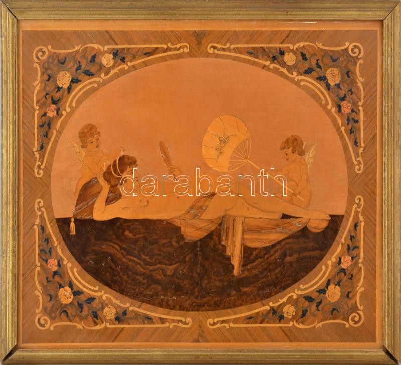 Description: Dobos Andrásné (?-?), XX. sz. közepe: Női szépség puttókkal. Intarzia, falemez. Jelzés nélkül. Felületi sérülésekkel. Dekoratív, sérült fakeretben. 44,5x56,5 cm