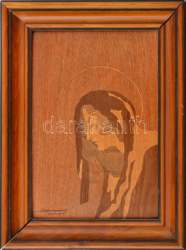 Dobos Andrásné (?-?), XX. sz. közepe: Szecessziós hölgy. Intarzia, falemez. Jelzett. Dekoratív, sérült fakeretben. 30x21 cm