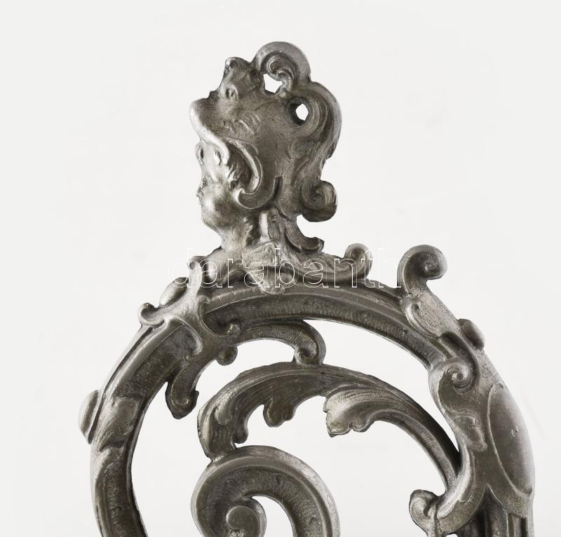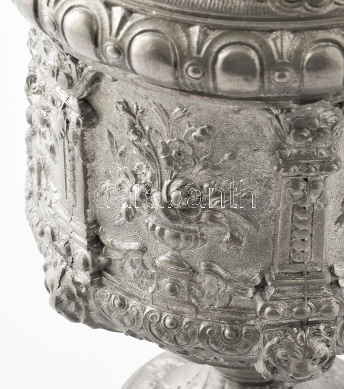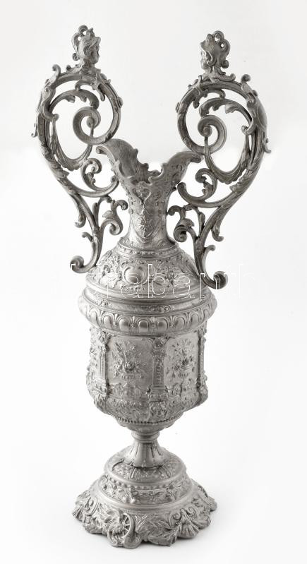 Description: Osztrák-Magyar Monarchia, cca 1890, Amfora váza. Nagypolgári lakásból származó spiáter váza, neorokokó stílusú díszítéssel, fejdíszes, rokályokból összeálló fülekkel, jelzés nélkül, kopással, m: 59 cm