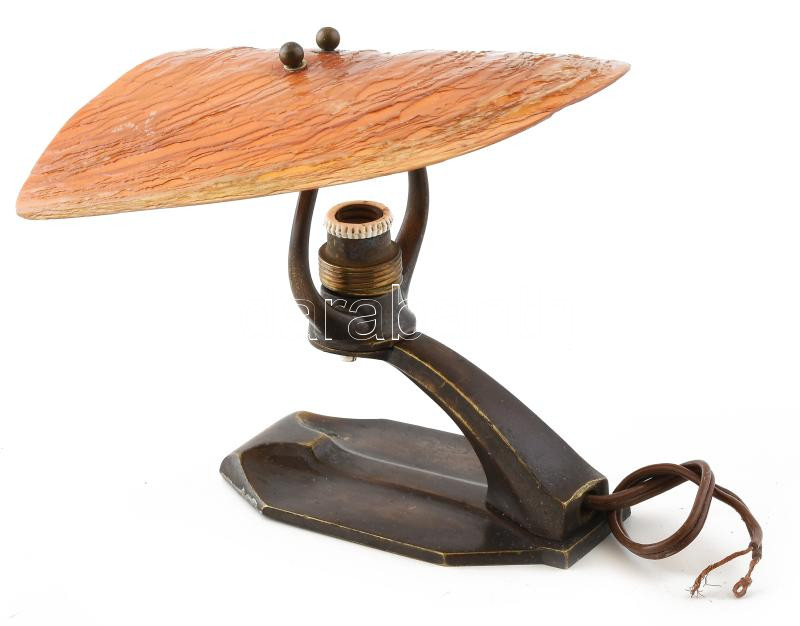 Description: cca 1920-1930 Varga János bronzműves Debreczen bronz falilámpa kar, ritka, óriáskagylóból faragott ellenzővel. Jelzett, restaurálás nyomaival, 16x16x16 cm