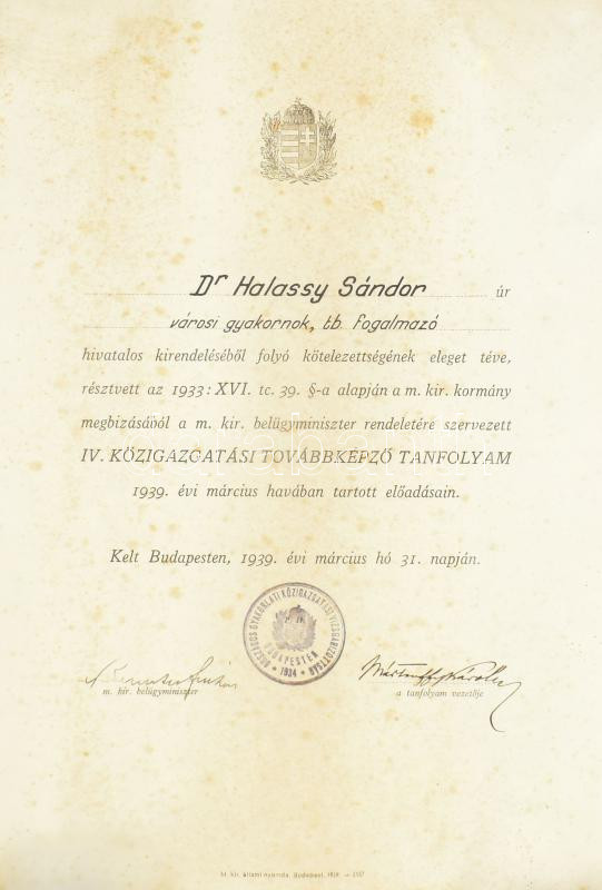 1939 Keresztes-Fischer Ferenc belügyminiszter által aláírt számvevőség...