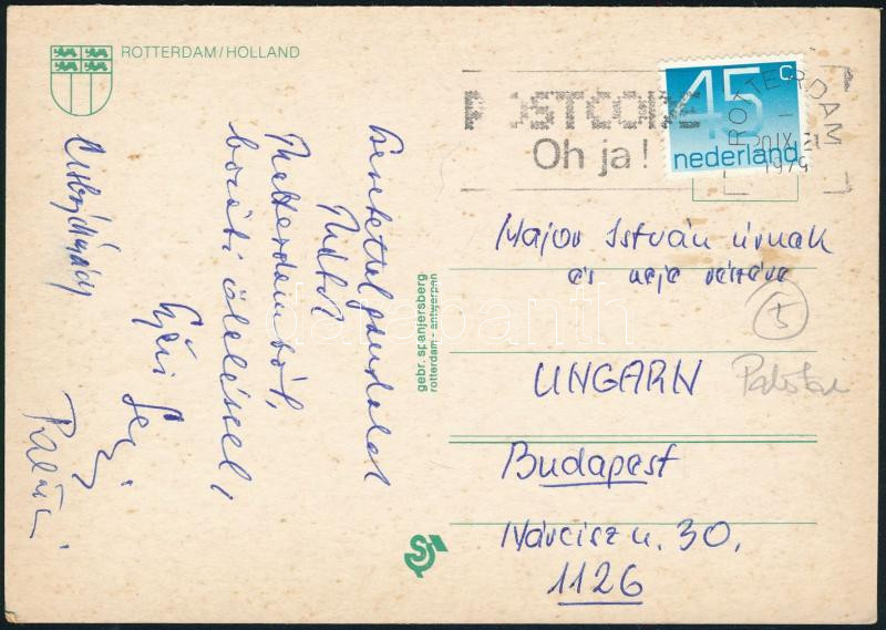 1979 Palotai Károly és mások aláírása Rotterdamból hazaküldött képeslapon