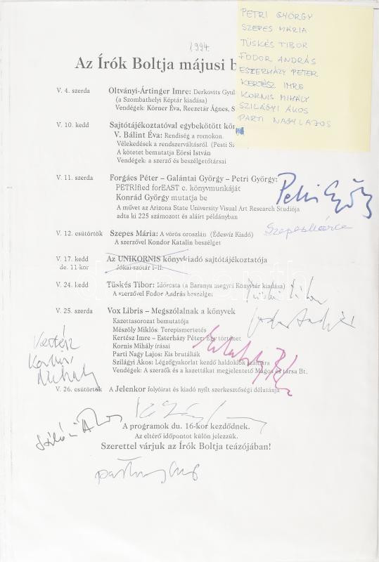 1994 Az Írók Boltjának májusi programja aláírásokkal, Petri György, Es...