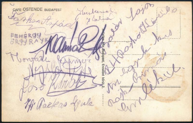 Kalmár Pál zeneszerző és a Rajkó zenekar egyes tagjainak aláírása Café Ostende fotólap hátoldalán