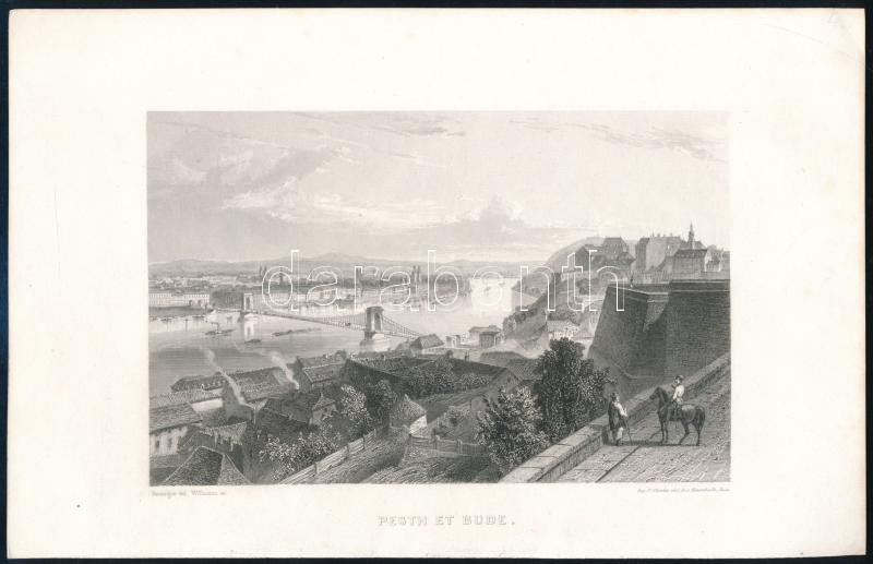 1859 Adolphe Rouargue (1810?-1870) - Eduard Willmann (1820-1877): 'Pesth et Bude.' Pest és Buda látképe, In: Voyage pittoresque en Allemagne partie meridionale (Paris, 1859), acélmetszet, papír, jelzett a nyomaton, paszpartuban, 11x17,5, lap: 17x26 cm, 26x35 cm