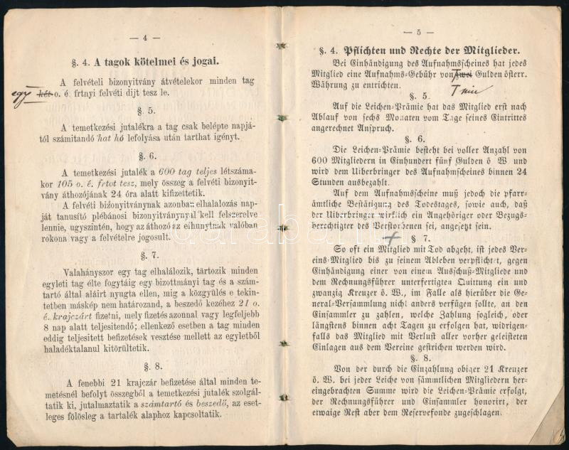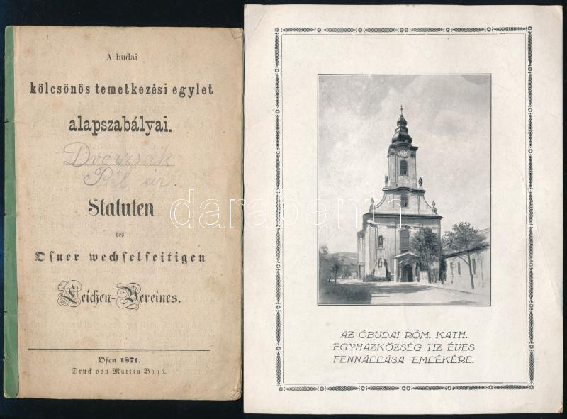 1871 A Budai Kölcsönös Temetkezési Egylet alapszabályai. Statuten des Ofener Wechselseitigen Leichen-Vereines. Ofen, 1871, Martin Bagó, 17 p. Kiadói papírkötés, néhány javítással és bejegyzéssel a szövegben. + Az Óbudai Róm. Kath Egyházközség tíz éves fennállása emlékére, rajta: Óbudai Szent Péter Pál főplébánia templom, emléklap, 20x16 cm