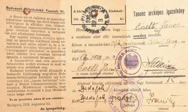 1938 A Budapesti Helyi Érdekű Vasutak fényképes tanoncbérlete a Budafok-Gellért tér útvonalra, pecsétekkel